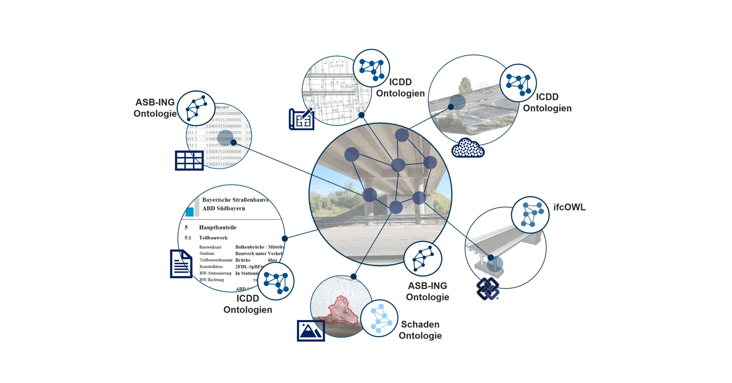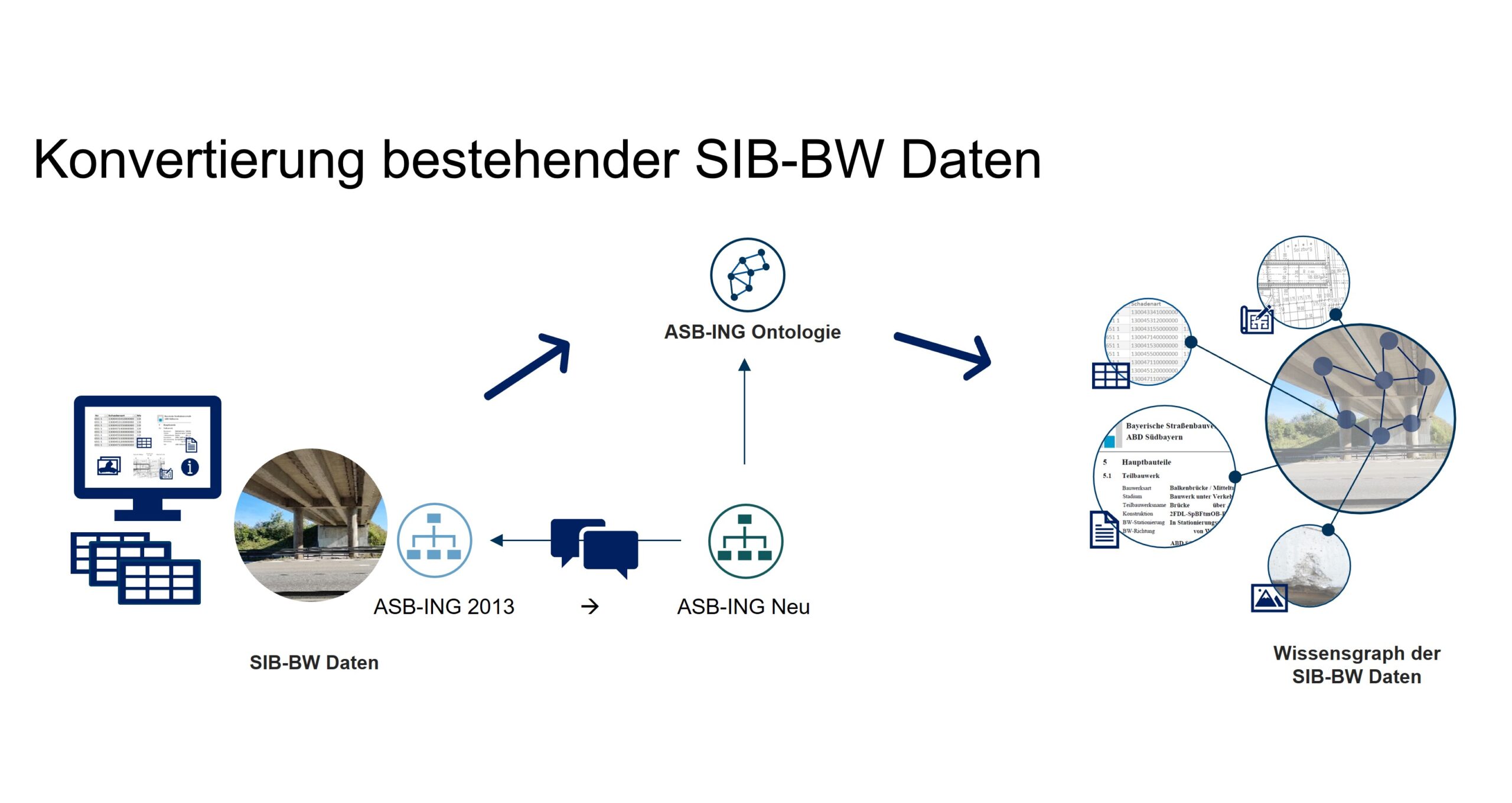 A central component of the research was the processing of existing, heterogeneous bridge data from proprietary database systems into open data formats of the Semantic Web, enabling the data to be interlinked. In this context, the predefined structure of bridge documentation data (ASB-ING) was transformed into an ontology. This enabled the conversion of the data sets from the construction database into the Linked Data Format.