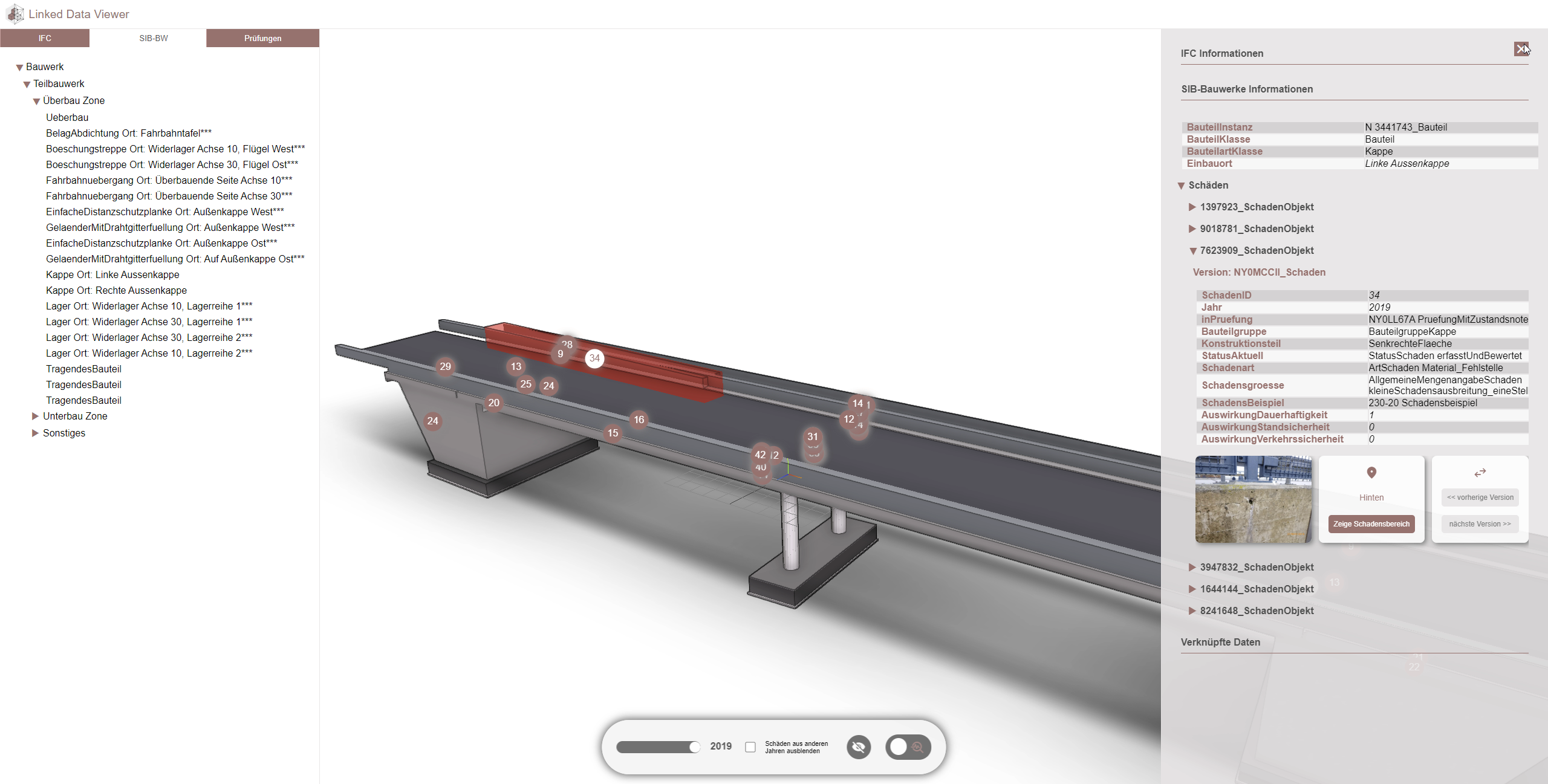In the second step of the research work, the converted data was linked on object-level with the results of the other work packages (point cloud, model, segmented damage pictures) and stored in a structured way in an ICDD container. On this basis, a prototypical viewer was finally developed that can display and query the semantic data from the existing database overlaid with the newly acquired 3D data.